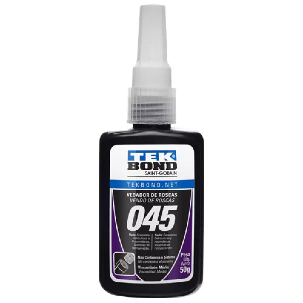 O adesivo Tekbond 045 é um vedante químico anaeróbico, de média viscosidade, baixa resistência à desmontagem e alta resistência à pressão. É recomendado principalmente para vedações de conexões hidráulicas e pneumáticas: sistema de refrigeração e gases. Não polui os sistemas e pode ser desmontado com ferramentas manuais simples.