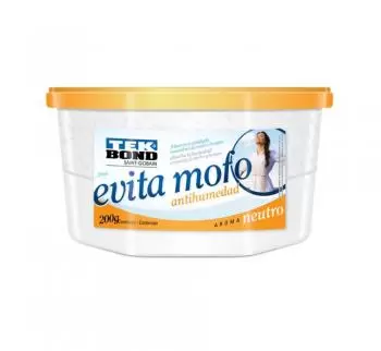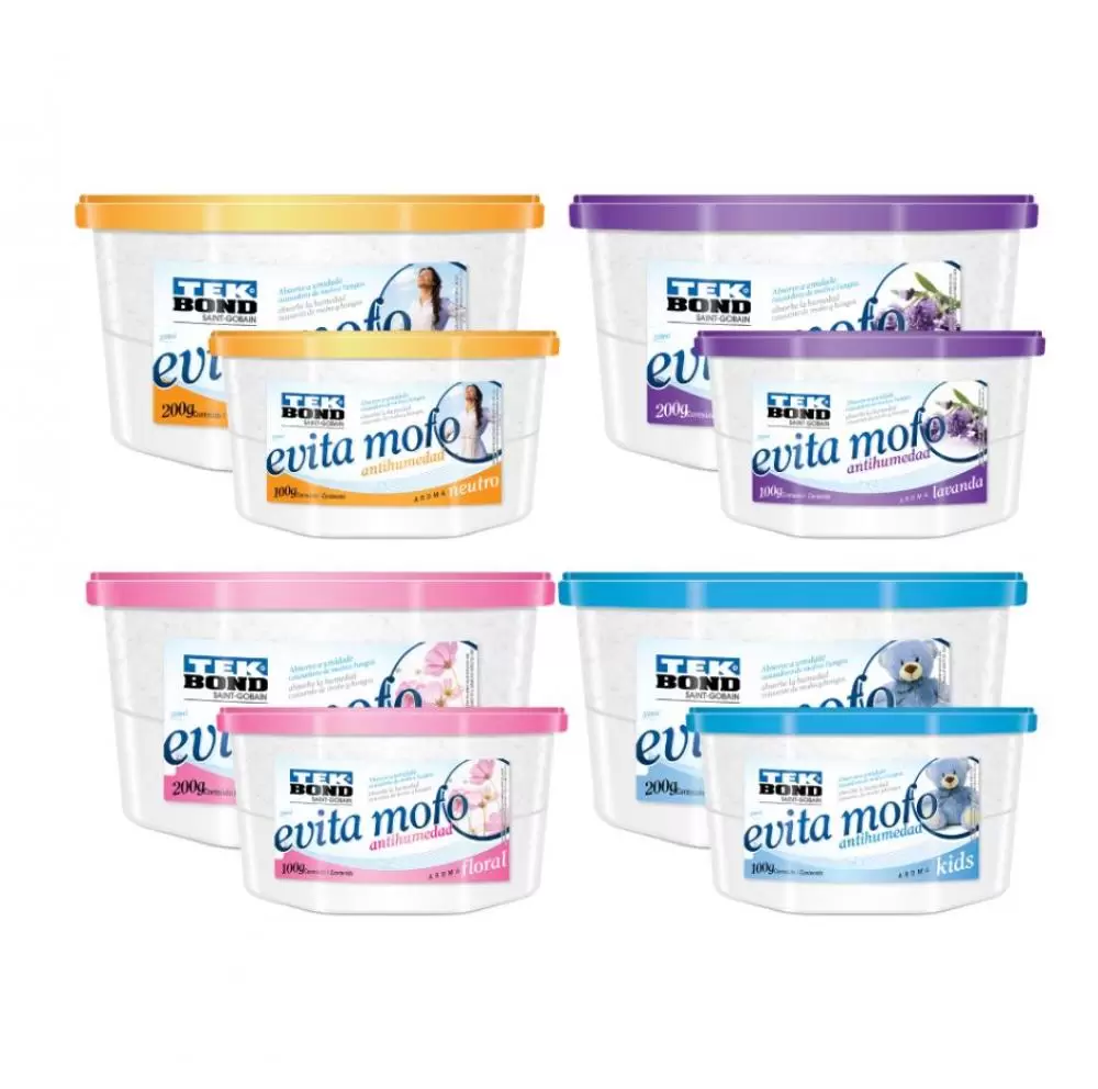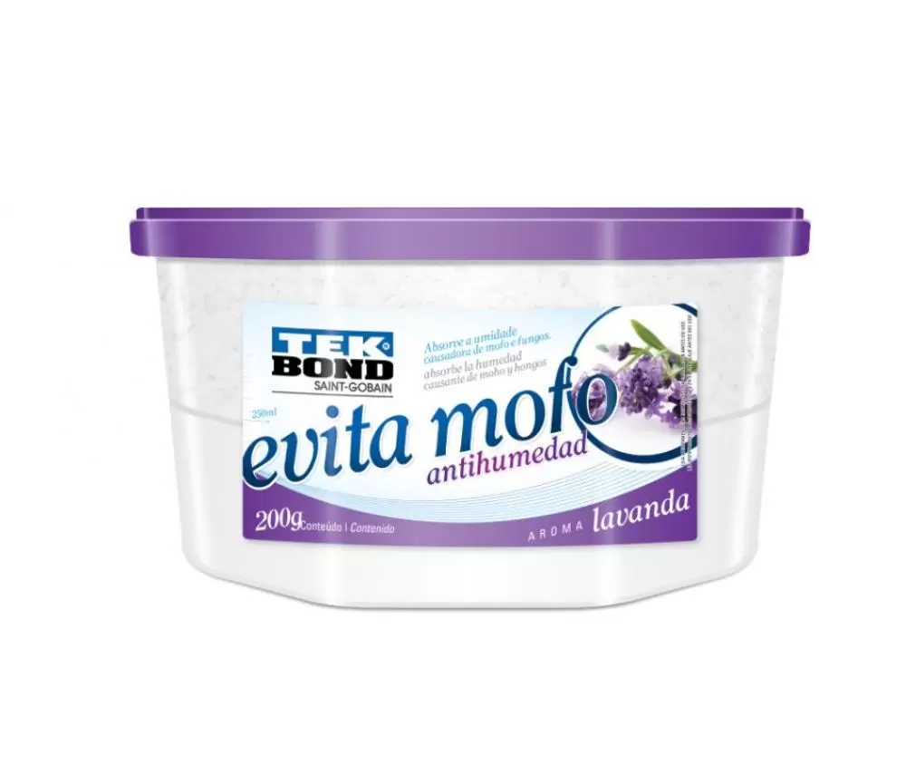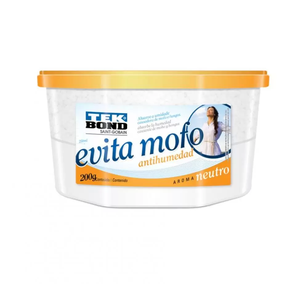 CONSULTE O AROMA DISPONIVELKIDSNEUTROFLORALLAVANDAEVITA MOFOO Evita-Mofo Tekbond é um desumidificador de extrema eficiência que, além de remover a umidade do ambiente, ainda deixa uma leve fragrância enquanto age. Evita problemas com mofo, fungos e mal odor em armários, gavetas, guarda-roupas, baús, dispensas, sapateiras, cofres, barcos, bibliotecas, estoque de madeiras, ambientes fechados e úmidos, com baixa ou nenhuma circulação de ar, entre diversos outros. O Evita Mofo absorve a umidade do ambiente e armazena a água no pote. MODO DE USO:1. Limpe o local onde tiver mofo antes de colocar o evita mofo. 2. Remova a tampa da embalagem e retire o lacre de alumínio, com cuidado para não remover ou danificar o filtro branco que fica embaixo dele.3. Tampe a embalagem e coloque no local.4. Pronto! Ação do produto é iniciada de imediato.5. Quando o nível de água atingir o limite máximo indicado no rótulo da embalagem, substitua por um novo Evita-Mofo Tekbond.Atenção: Descarte o líquido acumulado no ralo e a embalagem no local de plásticos recicláveis. Se o líquido vazar do recipiente pode danificar o que entrar em contato (roupas, material de couro, livros etc.). Se o filtro branco rasgar ou a embalagem quebrar pare de usar e descarte o produto.