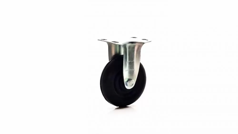 Informações Técnicas Rodízio fixo, linha leve reforçada com placa, marca ROD-CAR, com roda integral de borracha moldada com núcleo em ebonite (dureza 80 a 85 shore A), ref. FLR 310 BIF.